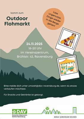 24 Nov 2025Am 24.11.2025 von 18 - 20 Uhr veranstalten wir wieder unseren Outdoor-Flohmarkt im DAV-Vereinszentrum in der Brühlstraße 43 in Ravenburg.